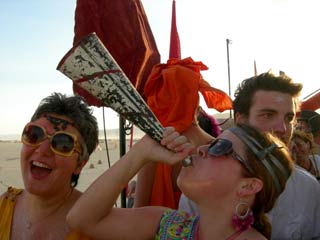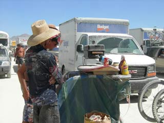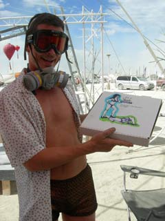 While trying to sniff out a famed and mythical barbecue setup (I was hungry and far from camp), the sweeties at Velvet Soulmine called me over and poured me a nice beer from their keg, and within ten minutes of hanging out with my new friend Jody over some sassy conversation, meowza, we got a surprise delivery from the Pizza Sluts! With a custom designed box. Hot! The bar was suddenly flapping with human vultures attacking the pizza, hilarious. The serendipity of the moment could not have been better. Thank you Pizza Sluts!