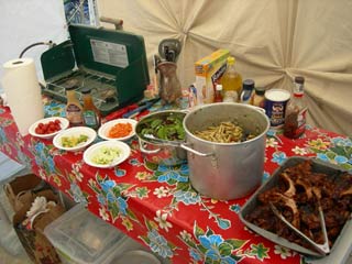 Over the years, and lots of trial and error, I was able to dial in a decent kitchen setup, bought a spiffy Coleman grill for quality breakfasts (the most important meal!), and even put on a +Rehab+ disco brunch one morning for over 60 people with the help of my friends and the hospitality of camp Comfort & Joy.