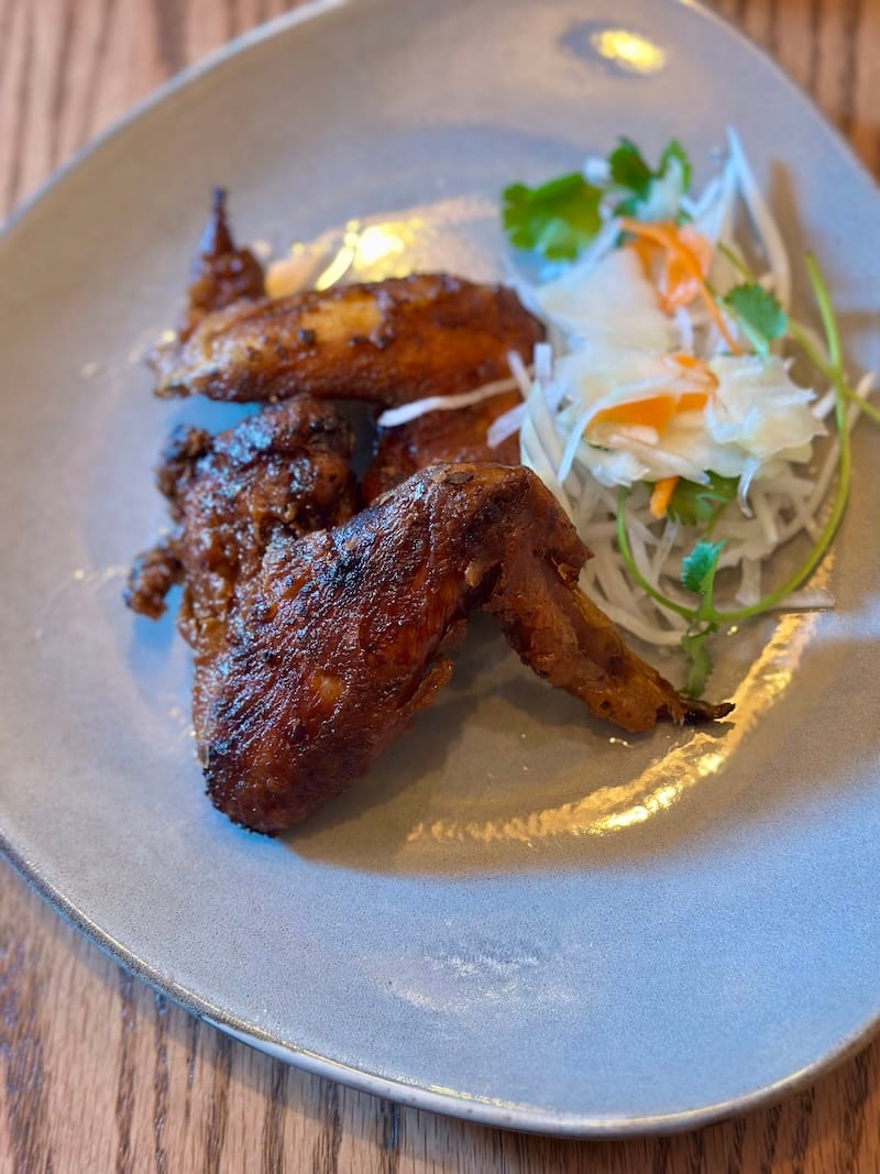 Soon, the shelves behind the bar will be filled with bottles since they have a full liquor license. The menu has some new snacky appetizers, which will be great for future happy hour at the bar, including cánh gà chiên (three Hanoi-style fried chicken wings; $18), gỏi đủ đủ (papaya salad; $15), and tôm bọc chiên giòn (crispy fried shrimp wrapped in wonton paper, served with dipping sauce; $15).