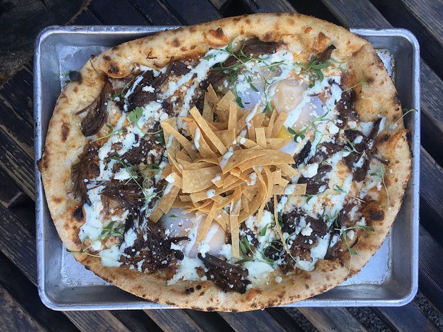 Also at The Hive: the folks at DRAKE’S DEALERSHIP are having fun with their new Wake + Drake weekend brunch service (served Sat-Sun 10am-12:30pm). The menu includes The Duck ‘n Syzurp ($16), a savory Belgian waffle topped with duck confit, candied orange, pistachio butter, and maple syrup (add a duck egg for an additional $2), and Pizzaquiles ($13), a breakfast pizza with braised short rib, enchilada sauce, cotija cheese, poached duck egg, and crispy tortillas. There’s Red Bay nitro cold-brew coffee on draft, plus bottomless beermosas (OJ plus beer), micheladas, and Brass Monkeys (made with Drake’s 510 malt liquor). 2325 Broadway at 23rd St., Oakland, 510-833-6649.