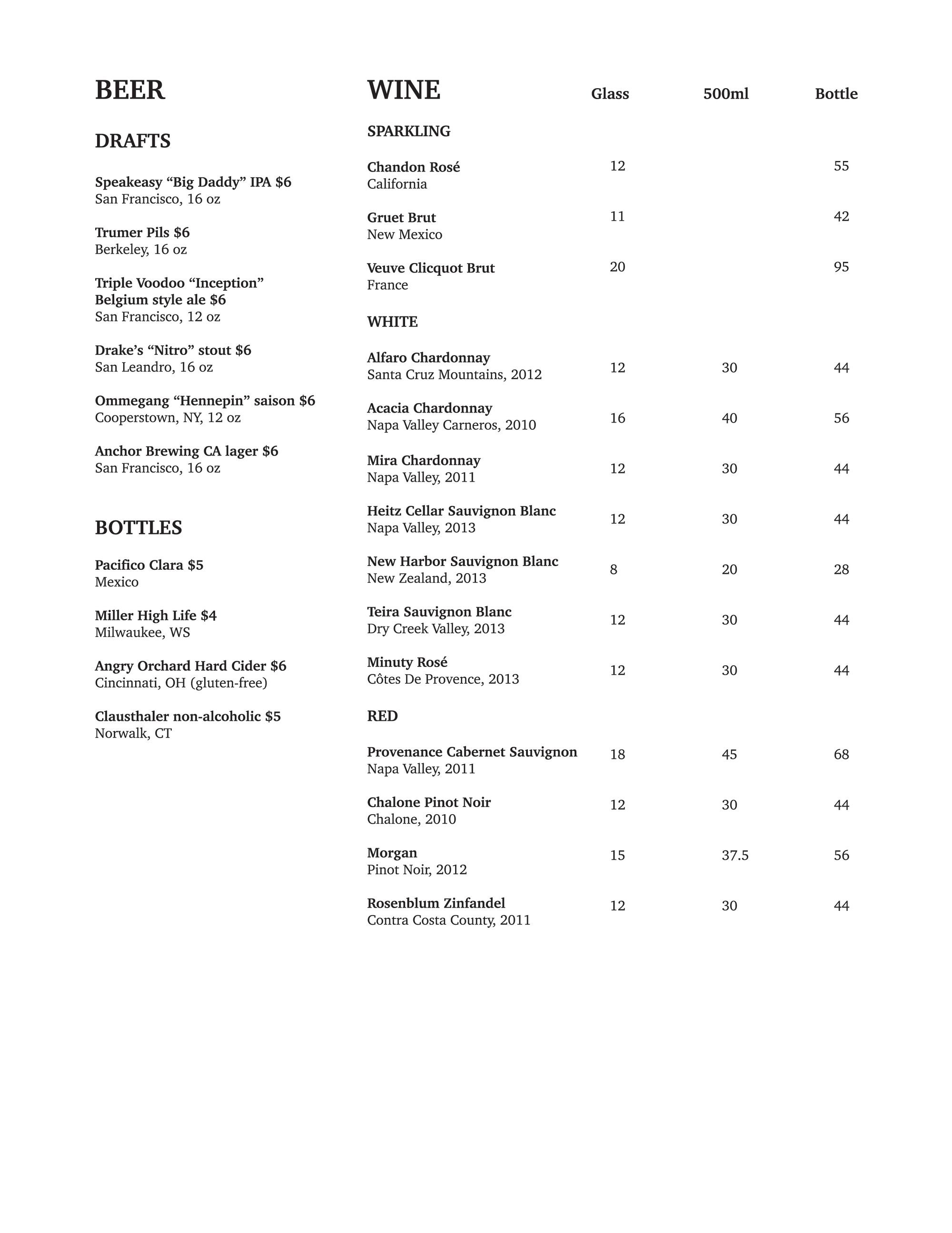 We talked more about the food last week, but here’s a recap: they’re serving brunch, lunch, and dinner, and bar snacks are a strong emphasis. They’ll also be offering a daily happy hour from 3pm-6pm, with both food and drink specials. A full liquor license is coming this week, and here’s the cocktail list they’ll be serving once that happens. In the meantime, the beer and wine list is up and running (er, pouring).