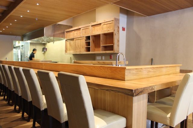 The entry hallway is all exposed brick, which extends behind the bar seating and all the way to the back of the restaurant. The bar seating faces a semi-open kitchen, with special areas for sushi preparation and a block of shelving for storage.