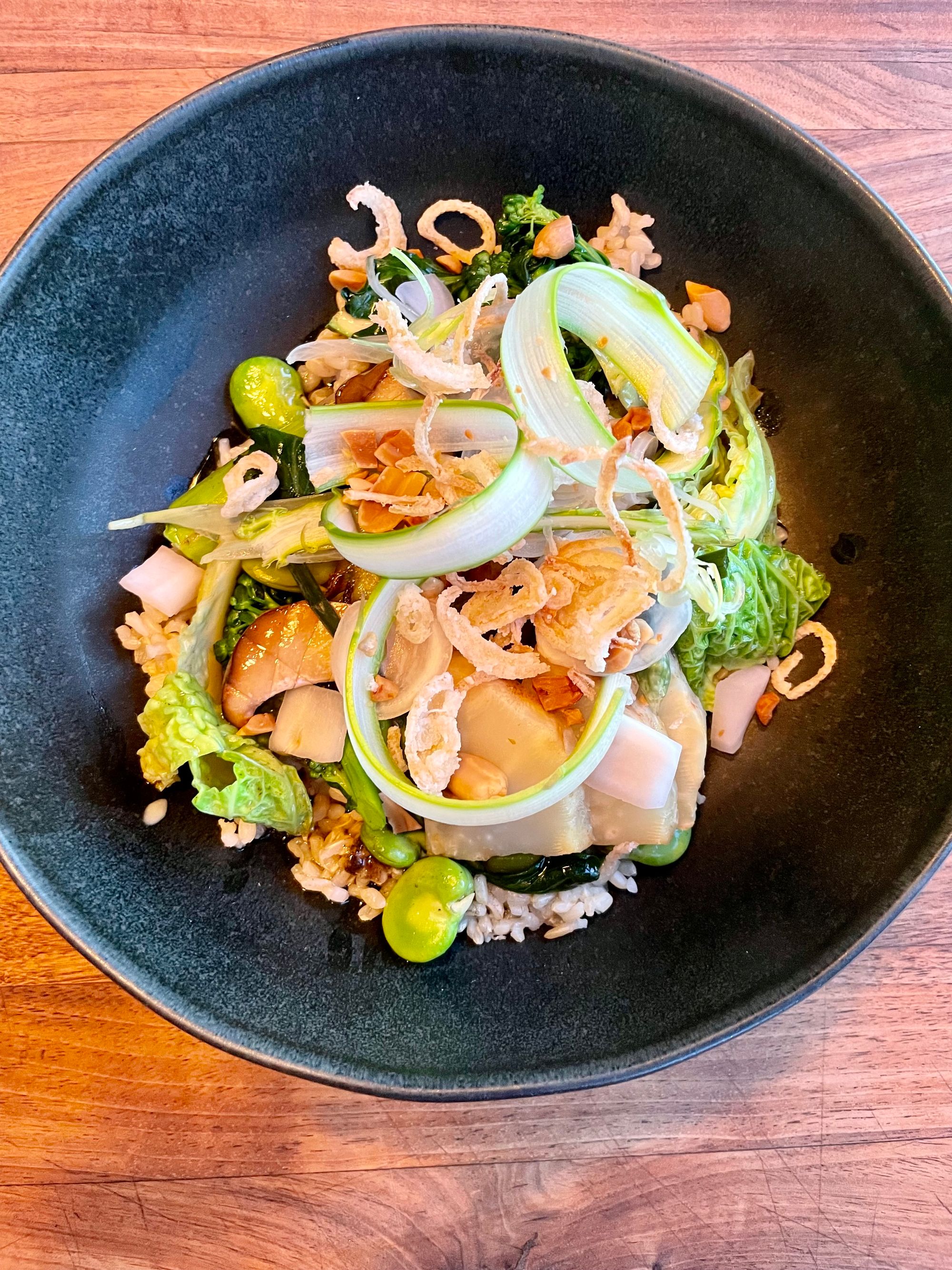 We also tried the coal-roasted turnip ($30), served simply with a “market haul” of Savoy cabbage, trumpet mushrooms, asparagus, celery, fava beans, and fried shallots, with the pop of pickled daikon and the crunch of peanuts over Koda Farms rice. It’s such a bountiful dish of the best produce—simple but so fulfilling. The entire menu reads like a who’s-who of our local farmers’ markets, with a variety of vegetable side dishes from other farms, and is a delightful celebration of springtime.