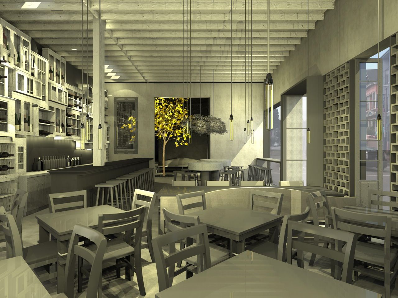 Adjoining the bar is a lounge area with seating for about 10, and a patio area to the right of the main entrance, where guests will be able to stand around a tree surrounded by a high table. (You can look at a rendering here.)