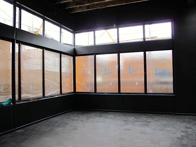 The day we toured the space, they were putting down the gorgeous tile in the patio area, which is from a fourth-generation tile-maker in Mérida. La Urbana is featuring tiles from many different decades—just wait until you see the massively tiled bathrooms! The beautifully curved glass doors for the main entrance were salvaged and shipped from Mexico as well.