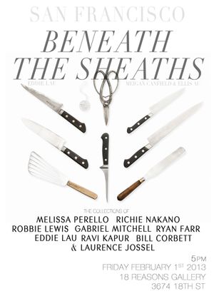 Known for his Dux dinners, chef Eddie Lau is starting 2013 with some new projects, ranging from events to workshops but first, an art show at ~18 REASONS~. “Beneath the Sheaths” was concepted by Lau, featuring images of chef’s tools (from Melissa Perello’s knives to Bill Corbett’s whisk to Ryan Farr’s cleaver) photographed by Meigan Canfield and Ellis Au. The reception is Friday February 1st, from 5pm-8pm. The show will be up through March 30th, be sure to check it out.