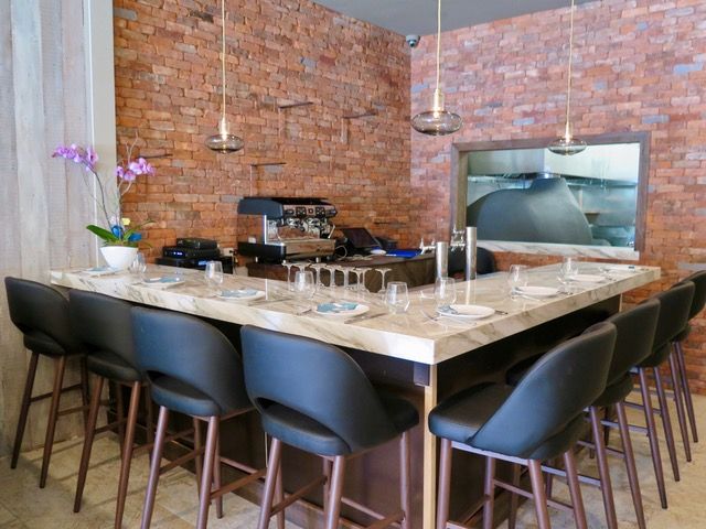 The space looks great, with windows that open onto the street with some outdoor seating (heat lamps will be coming soon). The space features tiled floors from Italy, a Mediterranean blue banquette, and modern light fixtures from Venice. The custom tables are live edge redwood, and there’s a wall of reclaimed wood. The eight-seat bar in the back is made from Calacatta marble, and the back wall features Italian bricks that are more than 100 years old—they are going to show old Italian movies on it. The entire look is contemporary, welcoming, and has a nice feeling with all the natural materials and color tones. It would work for a casual date or dinner with the family, it’s that kind of place.