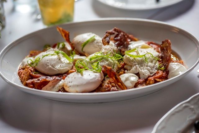 The favorite dish of the day was chef Puccio’s incredible creation: a Food Should Taste Good falafel chip shakshuka (it was almost like chilaquiles!), with spicy tomato sauce tempered by dollops of yogurt, plus peppers, onions, crispy pancetta on top, and perfectly baked eggs. Everyone was raving over it, and kudos to the kitchen for getting magnificently cooked eggs out all at once for 40 people.
