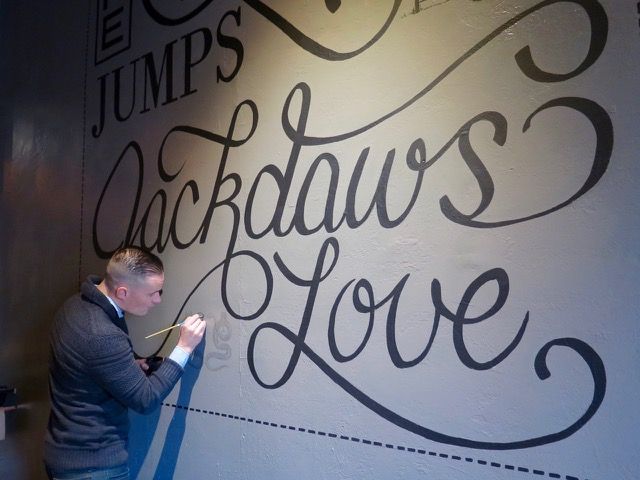 The space has paper-topped tables (doodling is encouraged), with a punch of color provided by the tufted vermilion banquette along one wall. Along another wall are two large custom pieces by designer and artist Matthew Wyne, a fun exploration in fonts and animal whimsy (you can see him at work here—he also did the custom pieces on the front windows). You can look at this short video of him painting the exterior sign.