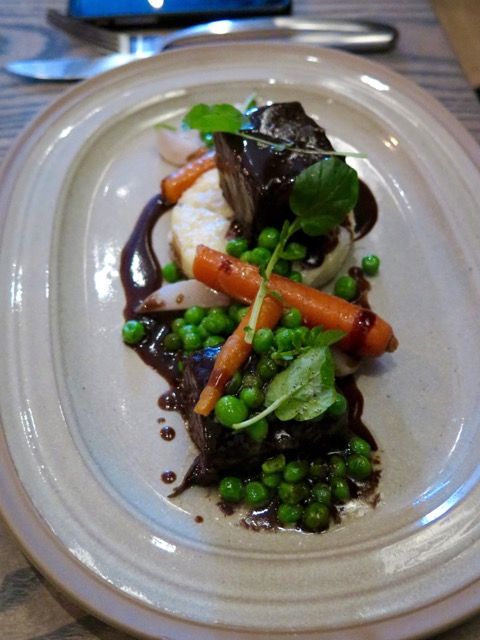 On the opening menu, my guest and I started with a Little Gem salad with meaty pieces of bacon lardons and a sunny-side up egg, and marinated calamari and roasted fingerling potatoes and Calabrian chile aioli; we had to supplement our meal with the hearty garganelli Bolognese, with a spoonful of burrata on top; and the main event was a short rib “pot roast” with potato gratin, and pan-roasted salmon with farro and an orange-sherry vinaigrette. You can also request bread, and you’ll get some Firebrand bread with burrata (I KNOW).