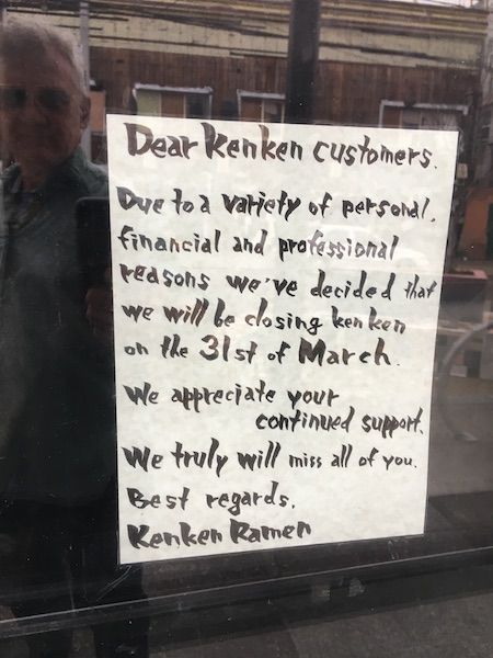 Just a block away, a friend let me know KEN KEN RAMEN has closed—here’s their farewell sign. Eater caught the liquor license transfer, mentioning Ramenwell will be moving in (it’s owned by Harold Jurado, formerly a Chicago chef—at Chizakaya—who is now living in SF and working at Bon Appétit Management Company). Stand by. 3378 18th St. at Mission.