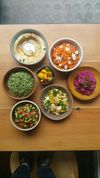 An array of salads and hummus at Sababa. Photo via Facebook.