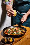 Wildseed’s supergrain paella for two with Beyond sausage, market vegetables, roasted cauliflower, saffron, grilled lemon, herbs, sofrito. Photo: Aubrie Pick.