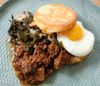 Smoked brisket, egg, braised greens, and English muffin from Marla Bakery. Photo by Molly DeCoudreaux.