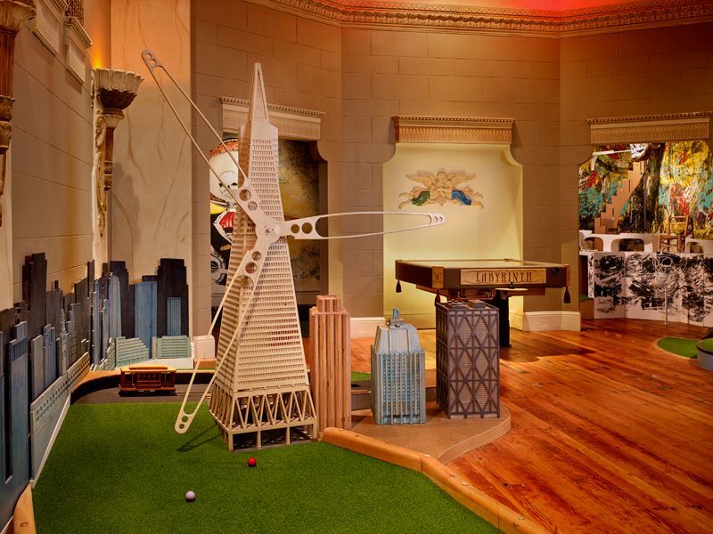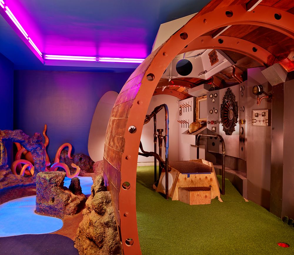 Last week I attended a preview party of URBAN PUTT, the whimsical mini golf and restaurant project in the Mission by Steve Fox. The 14-hole course has a bunch of SF references, from the Transamerica building to a section dedicated to the 1906 earthquake (Lotta’s Fountain in effect), plus you’ll see some Steampunky effects and Rube Goldberg-style stuff too, and there’s even Jules Verne’s Nautilus. You can quickly see how it took quite a geeky crew of designers, robotics engineers, welders, and artists to pull it off (viva geeks!).
