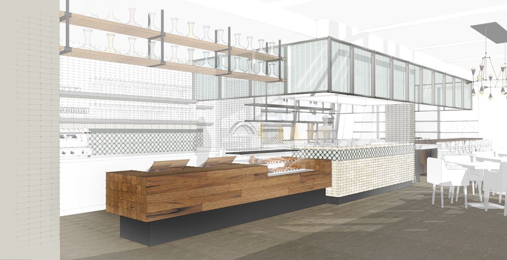 The cuisine will be Mediterranean in style, serving casual breakfast (smoothies, eggs, plus a juice bar), lunch (panini, soup, salads, flatbread pizza, plus larger entrées), happy hour (you’ll find small plates and charcuterie in the bar), and dinner. Per BAMCO’s company policy, all the ingredients will be sustainable and humanely produced, with local produce figuring prominently. There will also be local coffee, cocktails, craft beer, and wine on tap.