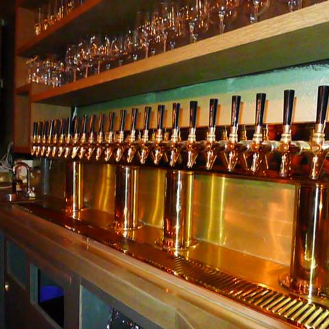 You’ll find some seats at the bar, while the majority of the seating is at high-top tables with metal stools along the wall. Some cool features include a mural by artist Andrew Schoultz (known for his trees), and the roll-down door features a great piece by Ben Eine—oh, and check out the brass taps.