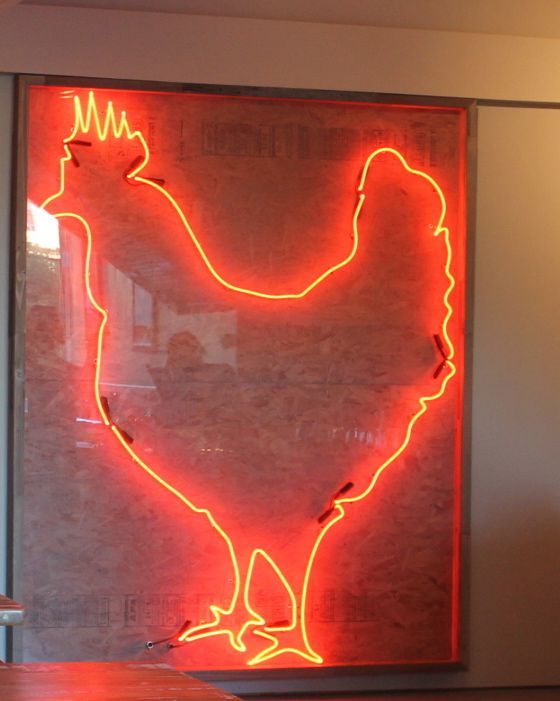 The interior is spare, with bright red chairs, poured cement floors, wood-topped tables, and a giant neon chicken outline on the back wall. The chicken theme runs pretty strong, actually, with chicken wire shelving, large-scale portraits of chickens, and rubber chickens on the counter. Bwok. The only dessert option is Feingold’s chocolate egg on a stick (which answers that age-old question, unless you eat dessert first). You order at the counter, then take a seat. The place specializes in takeout and will also offer catering. Starting Friday October 25th, they will be open until 2am on Fridays and Saturdays. Right now, hours are every day 11am-9pm (Sun-Thu hours will not change). 1750 Market St. at Octavia, 415-864-2454.