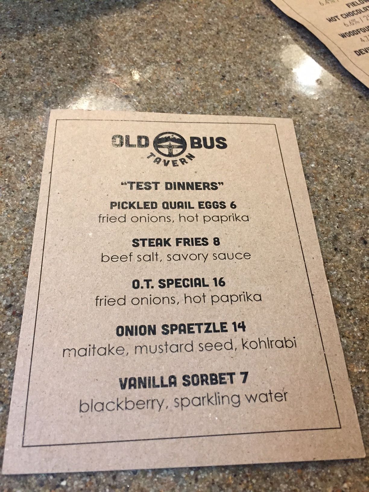 In advance of their grand opening in the former El Patio space in a couple of weeks, brewpub OLD BUS TAVERN has been hosting some test dinners Wed-Fri, with a limited menu and pouring a variety of guest draft beers (their own brews aren’t ready just yet). A tablehopper reader forwarded chef Max Snyder’s test menu, sharing that the steak fries feature beef salt, which is “dried beef tongue, paprika, etc., mixed with salt. Ummmm, yeah.” There are also pickled quail eggs with fried onions, chili with slow-cooked chuck, and onion spaetzle with maitake mushrooms, mustard seeds, and kohlrabi. And, of course, there’s a mighty sick burger, with housemade bacon and more fried onions. Stand by for news on the official opening and more details soon. 3193 Mission St. at Valencia, 415-843-1938.