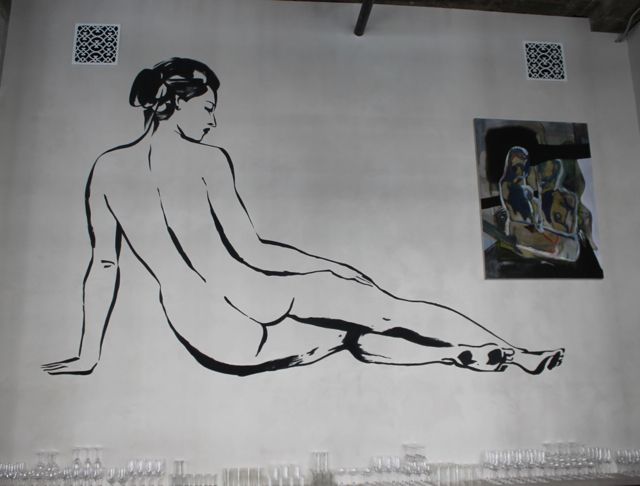 A great deal of attention has been paid to the interior design of the space, as well. Two graphic artists from New York, Erin Knutson and Grace Robinson-Leo of Study Studio, did all the art direction for the restaurant. That means that they’ve essentially “curated” a selection of art for the walls, all of it by women artists. They wanted to look at the cliché of the female nude in old-school bars through a contemporary lens. Particularly, they were looking to reexamine the 1960s bar culture, especially in France. To that end, they commissioned artist Ebecho Muslimova to design a female nude for behind the bar. It was painted by local New Bohemia Signs from a specially mixed paint made from raw milk, which gives it a more aged, matte look. Muslimova also created some humorous nude line drawings for the entryway (be sure to take a look at them) that offer a sassy take on the female nude (and charcuterie, wink).
