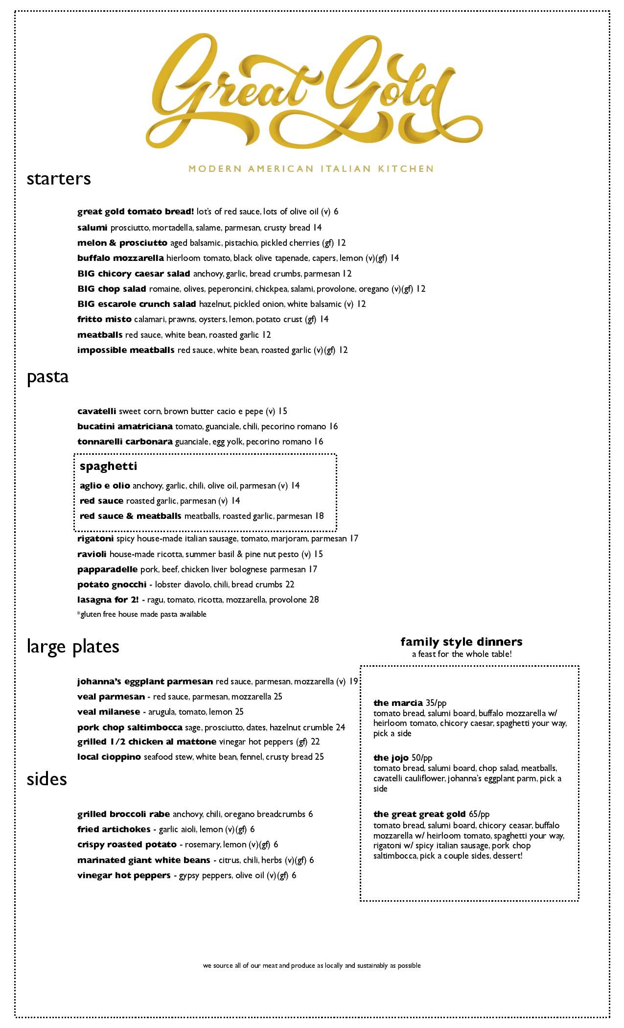 The menu has a big Caesar and chopped salads, a variety of spaghetti preparations, handmade cavatelli cauliflower cacio e pepe, eggplant parm, chicken al mattone, and Great Gold cioppino with local seafood. I also asked them why there wasn’t a veal Parm on the menu, and after some discussion, they added it back on, along with veal Milanese, so, you’re welcome.
