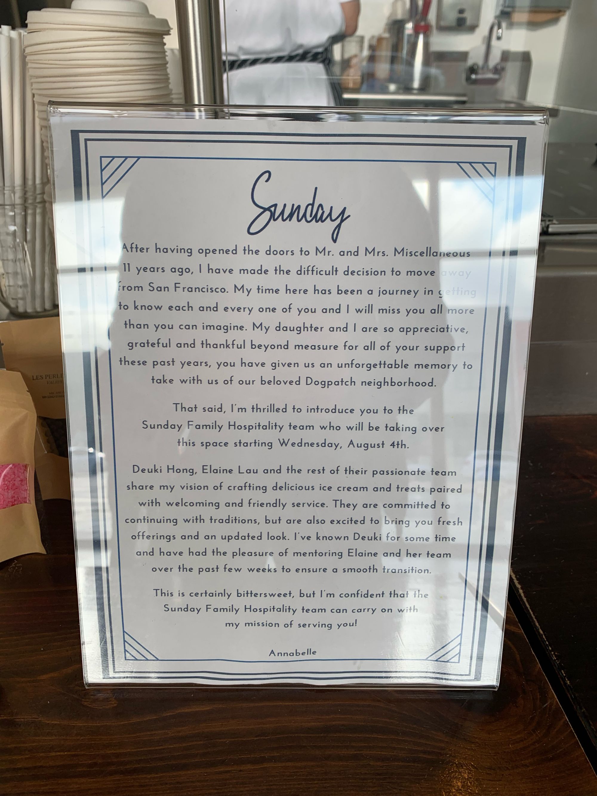 A tablehopper reader reached out with a depressing photo of a letter from MR. AND MRS. MISCELLANEOUS, announcing they were closing their Dogpatch ice cream shop after 11 years of scooping in the neighborhood. But great news: chef Deuki Hong and The Sunday Family team have taken over from former owner Annabelle Topacio, and are working with her to train their team on her recipes so some of her popular flavors live on. The location is now SUNDAY SOCIAL, running Thu-Sun 12pm-7pm, and will officially relaunch in October (look for additions like espresso, as well as cookies, pie, brownies, and more). 699 22nd St. at 3rd St. [Via Eater]