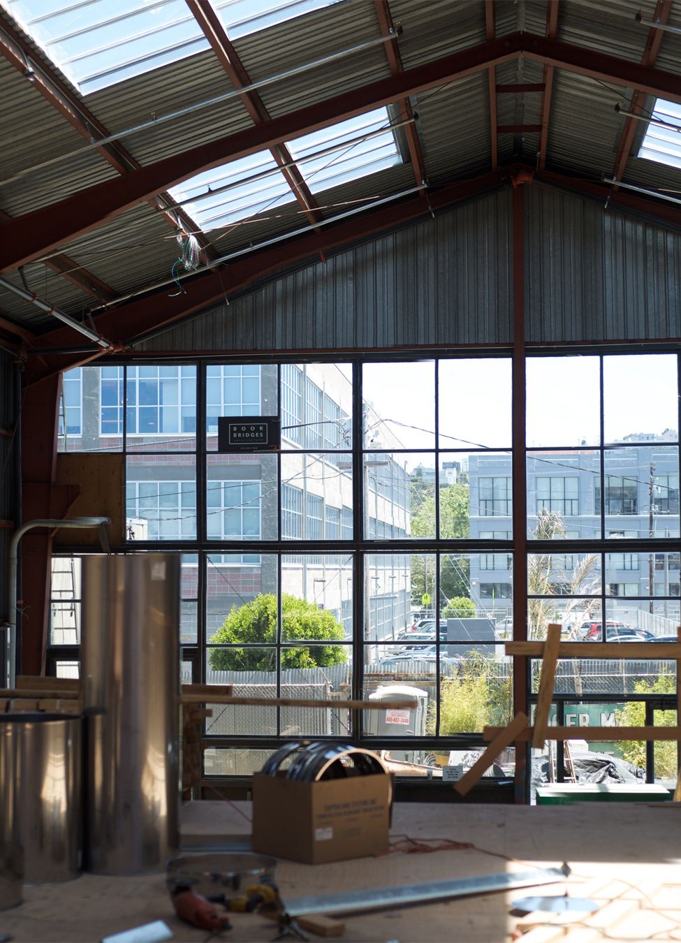In contrast to that quick decision, their elaborate build-out is a labor of love and a saga of permitting with the city two and a half years in the works. Boor Bridges is the architecture firm behind the transformation. (You might recognize the work of architects Bonnie and Seth at the new Four Barrel parklet on Valencia Street.) A major must for the Boor Bridges duo was bringing the light in with generous skylights and a stunning, custom-built glass front wall framed in galvanized steel for the gigantic, metal-wrapped, formerly dark edifice. The concept is centered on creating an indoor/outdoor feel no matter where you’re dining. There’s patio seating in the front, a lengthy bar along the right wall as you enter, and a dining room both downstairs and upstairs under the high ceilings. To the left is the giant roll-up door from which all that great beer will roll out into SF. Behind the downstairs bar area and bar-height dining area, the kitchen is housed under the mezzanine bar above. The mezzanine level has a stunning view through the glass front wall and will be available for private parties. (Think: best bachelor party ever.) And in the back is where all the brewing will take place.