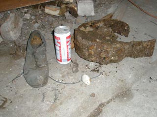 During the trenching process for the plumbing, the brothers have unearthed some pre-1906 earthquake and fire artifacts. 575 Howard, they tell me, was an old print shop after the rebuild of the downtown area, and the burnt, crumbled pieces of the former building were repurposed for the foundation of the shop. In the dirt below the foundation the guys have pulled 100-year-old children's marbles, old printing press wheels, and seashells, and in a more recent find: apparently whoever handled the remodel of the walls in the flower-child era left an empty tall boy of Bud in the wall. In fact, as the guys have peeled back the walls, they've exposed the old frame and have found burnt wood everywhere, all reused remnants of the 1906 fire.