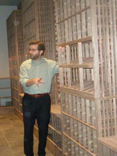 The wine cellar is reminiscent of a Roman aqueduct. This walnut-shelved space came about because the brick alcove already naturally felt like a cellar. The historic arches received double-paned glass and were temperature-ready. David mentioned that this space felt just right for the wines, offering up a slightly higher temperature than an average cellar in order to make the wines service-ready.