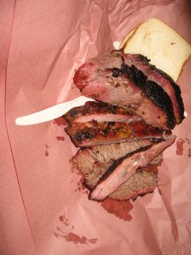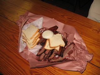 The setup is the same everywhere: you order by the pound, your order is sliced, weighed, and put on brown paper which doubles as plates. The barbecue comes with sliced white bread, sliced white onions, and pickles, also usually sliced.