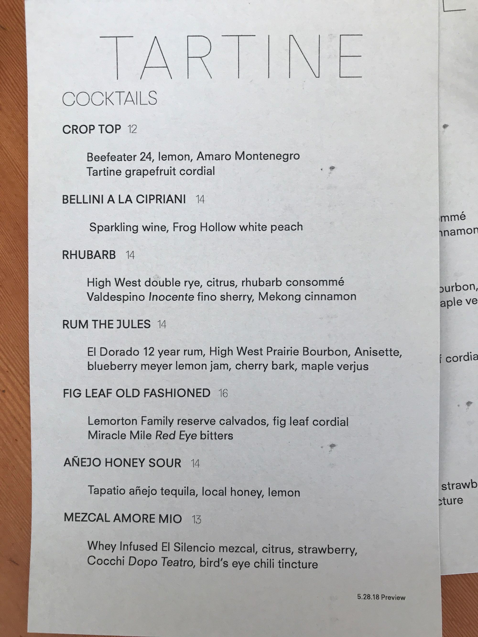There’s something very cool and refreshing and boozy happening at TARTINE MANUFACTORY, and that would be the launch of their new bar program and cocktail service from their new director of bar operations, Julian Cox. I popped in for lunch recently and enjoyed the Crop Top ($12), with Beefeater 24, lemon, Amaro Montenegro, and Tartine grapefruit cordial. There’s also the Rhubarb ($14), with High West double rye, citrus, rhubarb consommé, Valdespino Inocente fino sherry, and Mekong cinnamon.