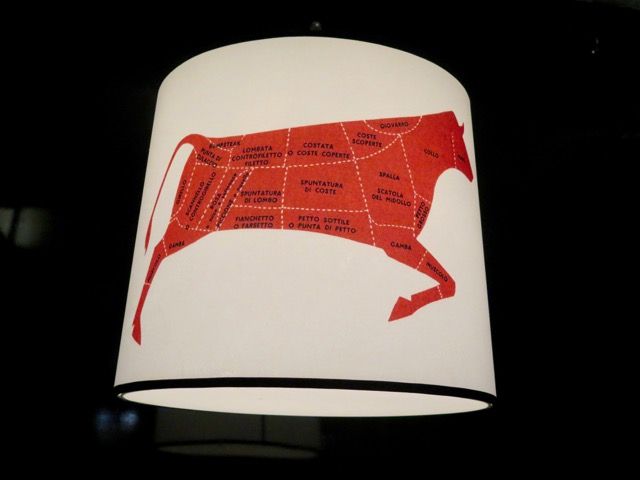 The décor has some fun touches, like lampshades featuring illustrations of cuts of beef in different languages, and the booths (which is where you hope your group gets seated) feature a TV screen with a burning log on repeat. On my list for next time: the banana cream pie and boozy grasshopper milk shake.