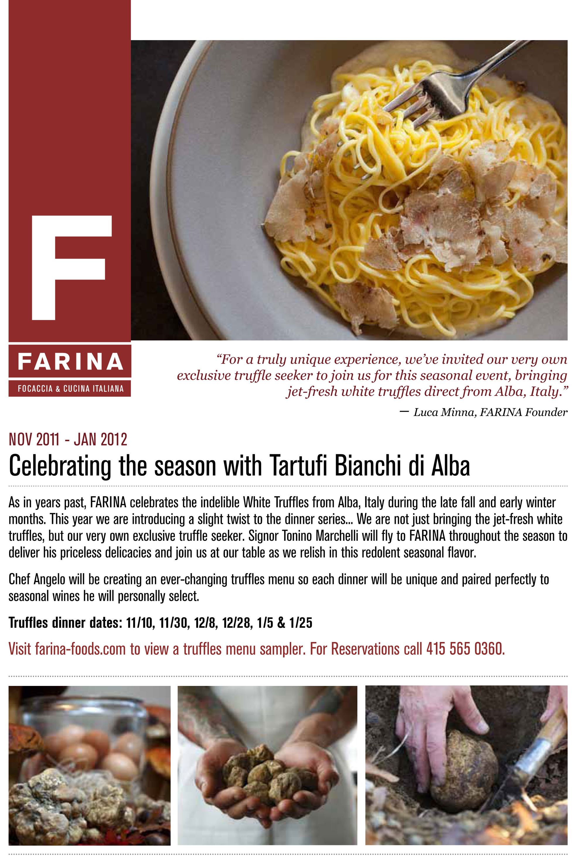 And for your calendar: truffle season is here, and Farina’s special contact who hand carries white truffles from Italy to the restaurant should be bringing them for special truffle dinners on November 10th and 30th. You will be able to choose from some special appetizers, pastas, and entrées to have the truffle shaved on (Auriana mentioned fonduta, risotto, and perhaps some dishes with duck egg or cardoon—he cooked a number of truffle dinners while at Valentino). Look for more special truffle dinners on December 8th and 28th, and January 5th and 25th (these will probably be black truffles). You can make reservations now.