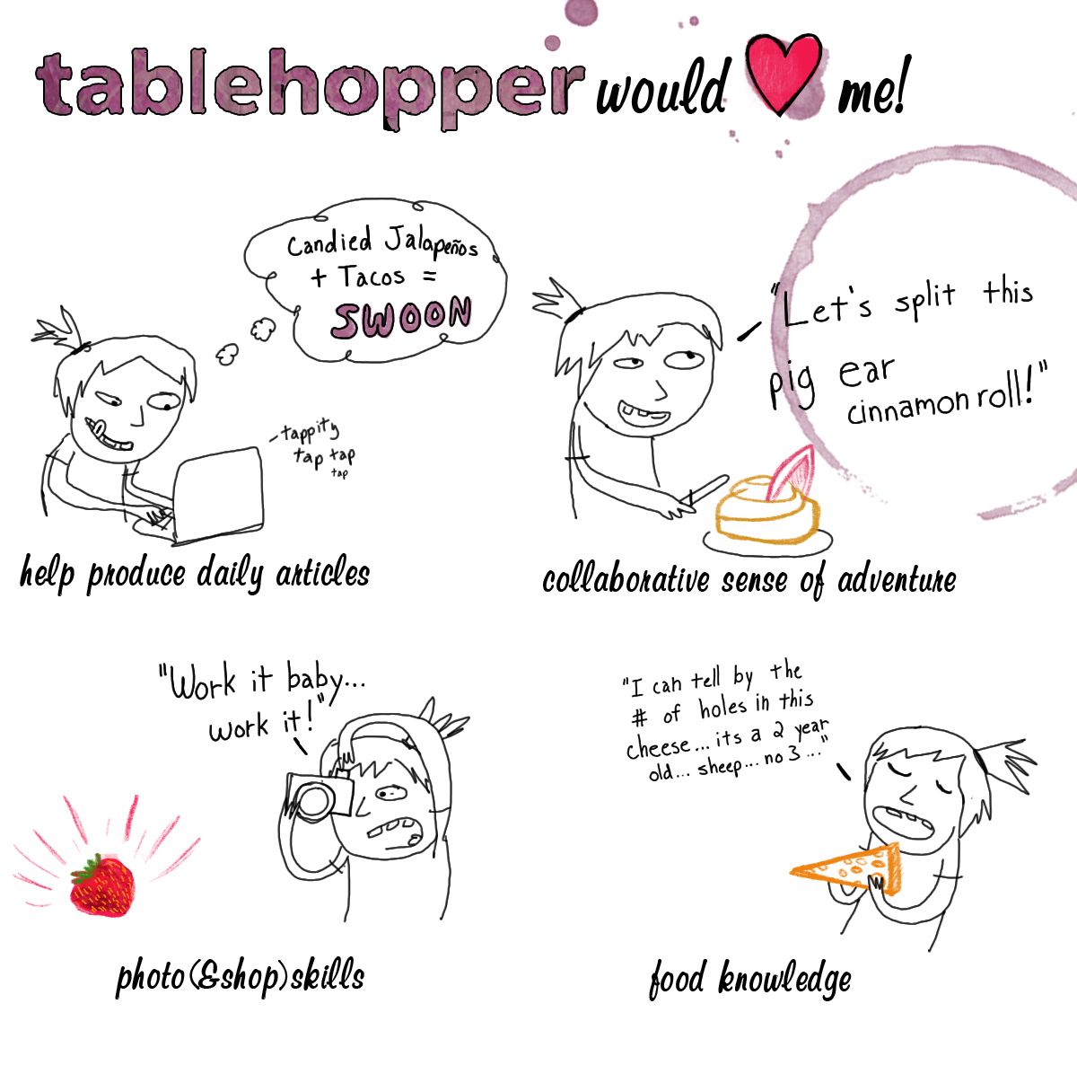 Well, I am doing one massive exhalation right now because after searching high and low, I have found my girl Friday (and Tuesday). That search process was rough, let me tell you. I mean, come on, how can you say no to someone who makes custom (and hilarious) artwork for their job application? Sadly, I couldn’t make an offer to the charming Eliza Kinkz, but hopefully I can recruit her to do some custom artwork for me in the future. Right? So adorable. Thank you to everyone who applied, it means a lot.