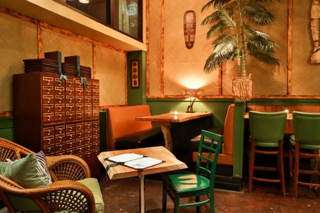 First, the space. It’s a stunner, with layers of thoughtful elements that transport you to an exotic location. The bar is made of two slabs from one monkeypod tree from the big island of Hawaii, with lush green leather stools. The back bar has some beautiful stained glass, along with a woven panel, bamboo, and a backlit bottle display. Low-slung, green leather seating can be found throughout the space, along with raw wood textures, bamboo, and live plants. In one corner, a specially built East African-style hut is on a dais with animal print flooring and a unique woven canopy (this space will be available for groups to reserve). On the walls, there are art pieces from around the world, including masks from the Masai people of Kenya, and original works from Papua New Guinea, Brazil, and Indonesia.