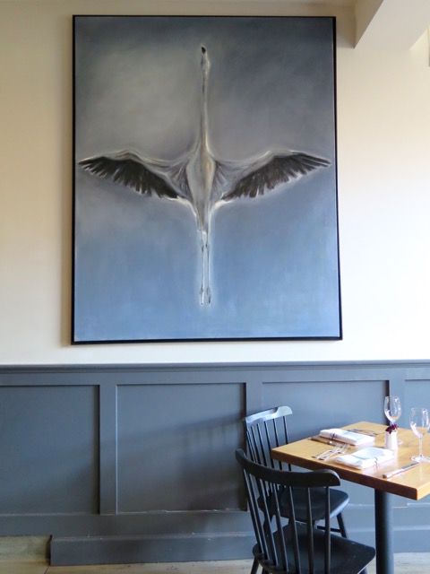 There is ample bar seating at a counter facing the open kitchen (partially obscured by frosted glass, but you can still see who’s in the kitchen—say hello to sous chefs Nick Fields and Ana Cabrera), and there’s a counter in a sunny nook by the front windows. Wood tables have comfortable space around them, outfitted with vintage silverware, fresh flowers, and classic bistro napkins. The walls are a calming Prussian blue—all the better to offset the vintage framed images of ladies and eclectic but deliberately chosen artwork and soft lights in the glass globes.