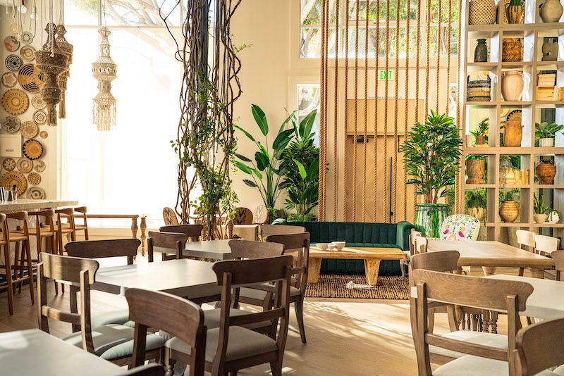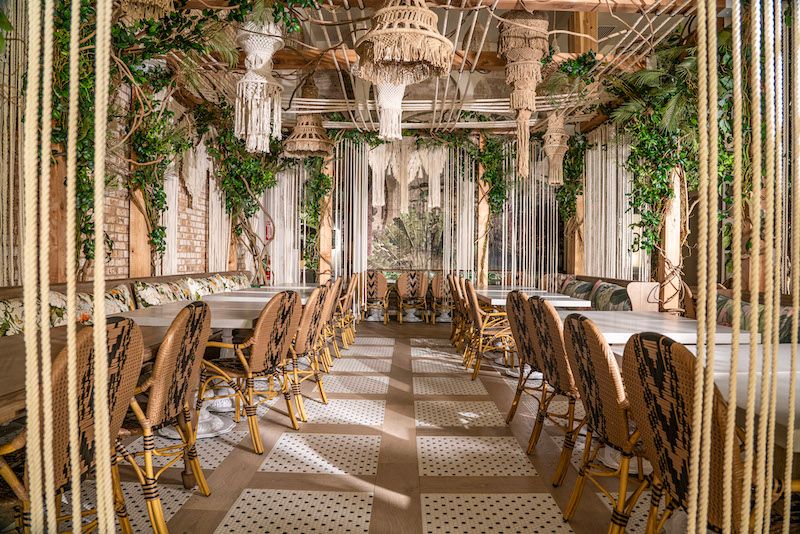 If you follow me on Instagram, you may have already seen my Reel with a look at the jaw-dropping style (designed by Schoos Design). This is the breath of fresh and airy design SF needed. The spacious venue already had soaring ceilings, but it now feels like a coastal getaway, with lots of plants and vines, draped macramé and strands of rope, pottery and baskets, woven and wood chairs, and natural, soothing tones. I love the off-white bases of the dining room tables, and the different environments throughout the 100-seat space.