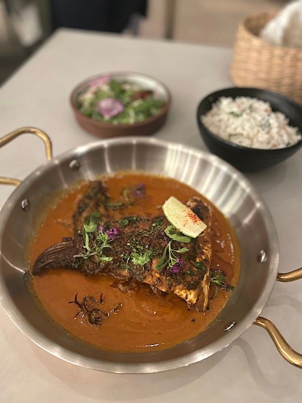 The cocktail menu from West Bev Consulting (Nora Furst, Stephanie Gonnet, and Christopher Longoria)—with some collaboration from mixologist Varun Sudhakar in Kerala—is a taste journey and ingredient education (do you know what ramacham is, or kokum?). The menu reflects local spirits, along with single malts, gins, and arrack from India. The silky and spiced Clarified Lassi Punch ($18) of rum and scotch has whispers of green cardamom and cayenne, and the Lemon Chili ($17) is an enticing showcase for lemongrass, mint, yellow chartreuse, Thai chili, and gin—both are excellent places to start, while the Jaggery Sour ($18) is how you want to end the night, a frothy number with Brucato Orchard, jaggery, orgeat, lemon, bitters, bourbon, and chocolate shavings. (I feel like it had my name on it.) There are three non-alcoholic cocktails, too, like the Salty City for the lassi lovers (yogurt, cucumber, salt, black garlic, and lemon).