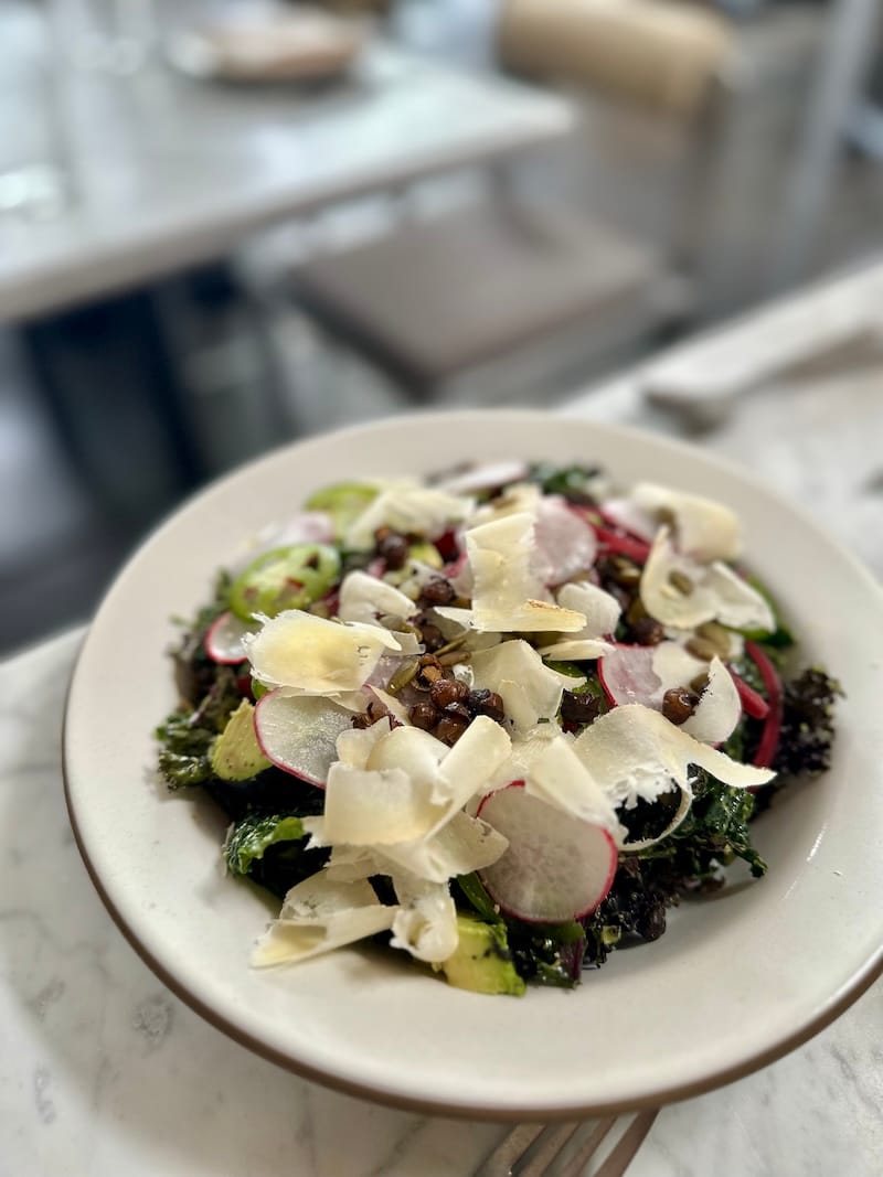 I hope you showed up hungry, because these midwesterners want to FEED YOU. I loved the surprise ribbons of pickled green tomato in their chow chow (instead of it being chopped up), all tangled up the lightly fried squid ($18), or you can go healthy with the abundant lacinato kale salad ($19) that was barely dressed in an avocado Green Goddess with flavor and texture hits from the fried chickpeas, pepitas, and jalapeño slices (the salad could easily serve four as a starter—and I appreciate they are using all of the kale leaves and not just the best parts).