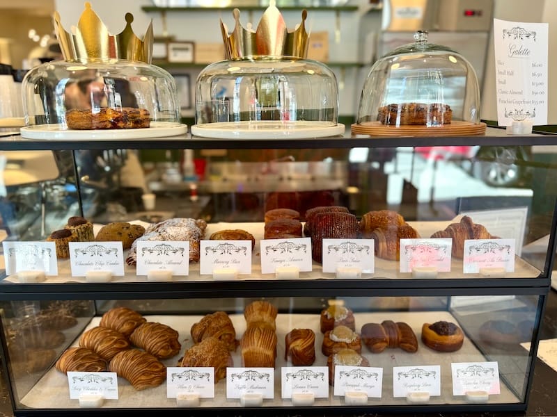 You’ll spot a morning bun (with orange zest), a kouign amann, and their roasted pineapple–mango flambé flower with rum and vanilla (which won Best Original Creation at the 2025 SF Croissant Competition). Everything is beautifully designed and formed, exhibiting classic techniques and quality ingredients—there is so much care and artistry and variety on display.