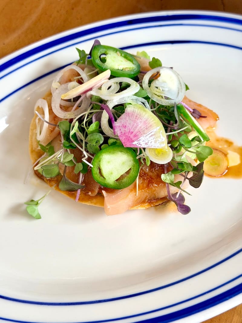 On Saturday, friends visiting town joined me for a crabby lunchtime feast at Popi’s Oysterette in the Marina, which I mentioned last week in my crab dish roundup. Chef Abel Padilla (who has been at Popi’s for the past year) wanted us to start with his special of Dungeness crab on wonton chips (they are delicate, eat them carefully over your plate; $32), with avocado, watermelon radish, and citrus aioli, and even though we were on a crab mission, the other special of albacore tostadas (with avocado) was a stacked and delicious starter (two for $20).