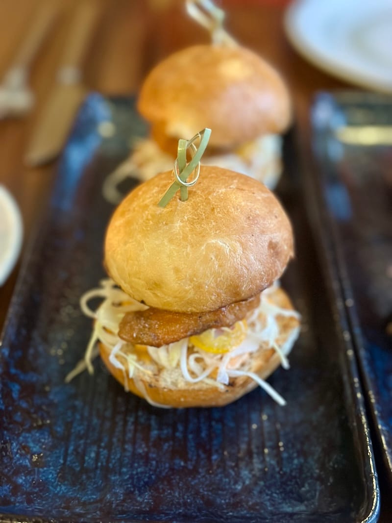 Two happy hour dishes: fried yucca croquette and a shrimp slider. Photo: © tablehopper.com.