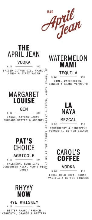 The team is excited to open in such a longtime North Beach location (it has been a bar for over 100 years!), on a well-known corner in one of SF’s most lively and historic neighborhoods. Open daily 2pm–2am. Follow @barapriljean for updates. 1371 Grant Ave. at Green.
