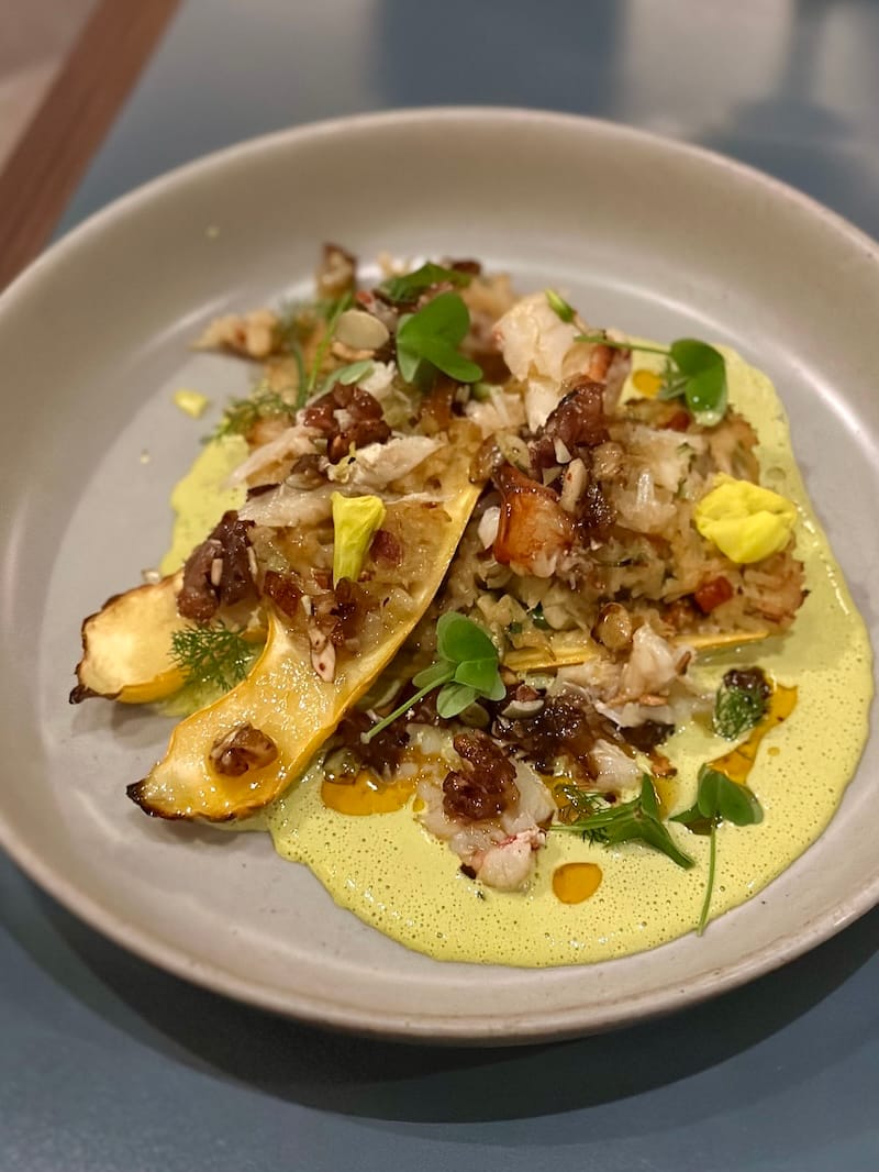 The hot shared plates include stuffed squash halves with a decadent Dungeness crab fried rice ($36), pepita and date crisp, and a golden nasturtium aioli, a total flavor journey with each bite.