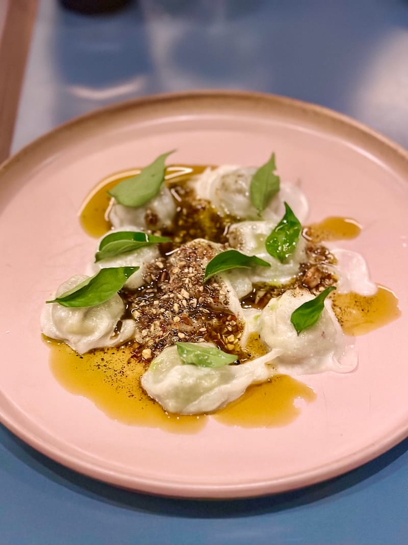 Dessert was all about the hazelnut pretzel baklava, with cherry blossom chocolate labne (decorated with petite blossoms) and cherry compote. I need to return for the habibi tiramisù made with Grand Coffee cold-brew coffee, and to see how the menu has evolved with the seasons—Maz posts updates with new dishes on @ilnasf, like uni dolma nigiri filled with short grain rice with fennel and white wine–steamed mussels, a harissa-spread on the grape leaf, which is then rolled up and roasted, and brushed with a whey-fish sauce-caramel glaze, whut.