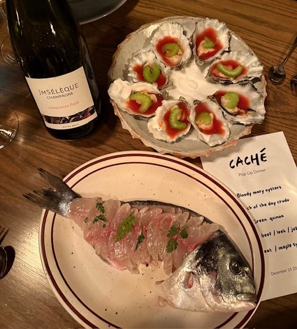 A look at Mounier’s five-course menu for the pop-up gives a hint of what’s to come at this neighborhood bistro: Bloody Mary oysters, catch of the day crudo, green quinoa, sliced beef with leek and jus, and buckwheat ice cream. Thomas explained the cuisine at Caché is inspiration-driven, and seasonal, and local—but it’s not French. Their wine list will be centered around natural and biodynamic wines, and there will also be low-ABV cocktails, and N/A options as well.