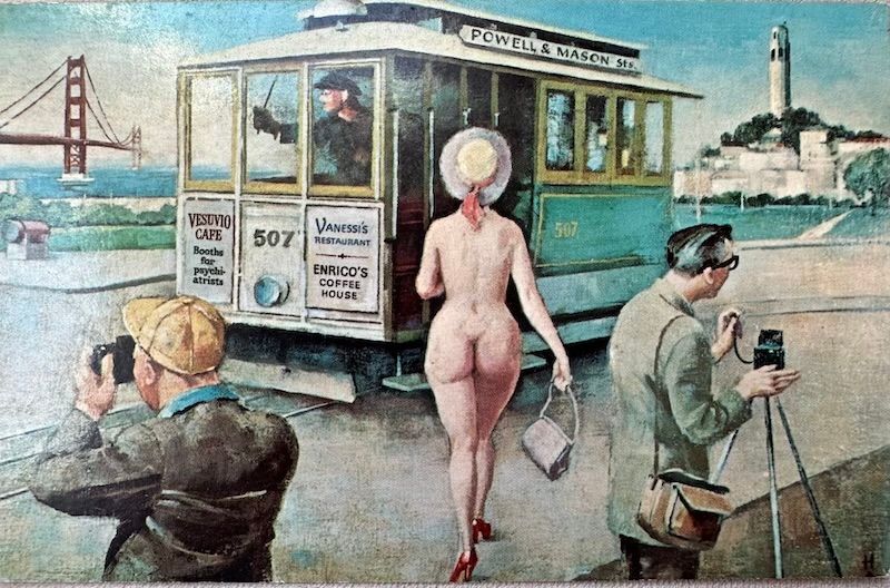 Lenoir went on to fill the space with art made by his friends and fellows, including the Homer Ansley painting above (aptly named “Double Exposure”) which he went on to copyright as a promotional postcard for the café. The painting gives *cheeky* nods to two other North Beach institutions—the now-closed Vanessi’s Restaurant and Enrico’s Coffee House—along with an adorably meta reference to Vesuvio and its infamous “Booths for Psychiatrists” sign.
