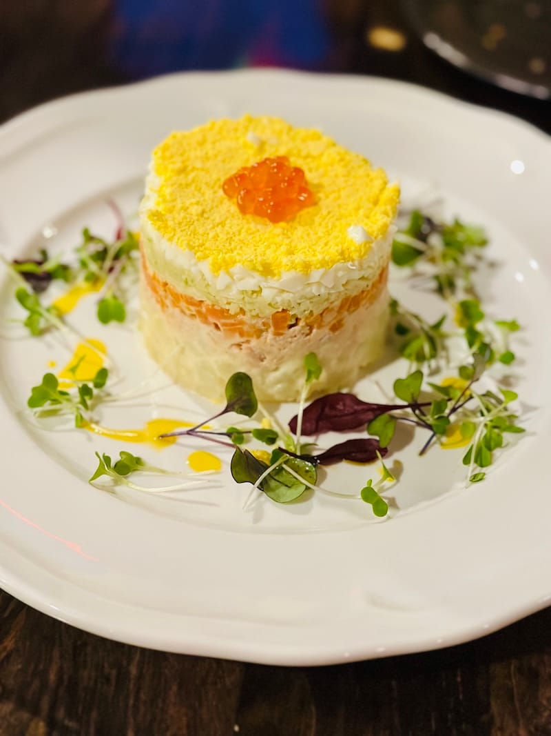 The presentations are colorful and whimsical, like a refreshing zucchini salad ($18) with two kinds of squash, fresh sheep’s cheese, and butter lettuce, topped with rice paper chips that were like little clouds. The vibrant mimosa salad ($20) is a layered cold salad with baked potato, carrot, baked salmon, apple, hard-boiled egg, housemade mayonnaise, and roe, which reminded me of a variation of shuba salad, or “herring under a fur coat,” but without the beets and herring.