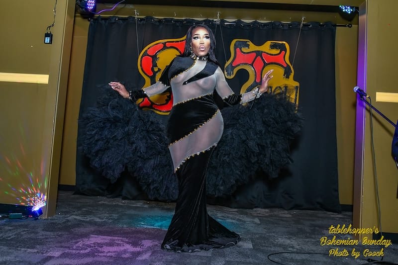 It was time to start the entertainment, a lineup of queer burlesque and racy performances, led by faaaabulous emcee Dottie Lux (gawd, I loved her bacon strip and bawdy banter all night—thank you, love!), and the smoldering and shimmering Paige Turner and bodacious Bionka Simone (ooooh, dangerous curves!) burned us up with their hawt numbers! Meowza! Va-va-voooom! Thank you for owning that stage, you gorgeous babes!