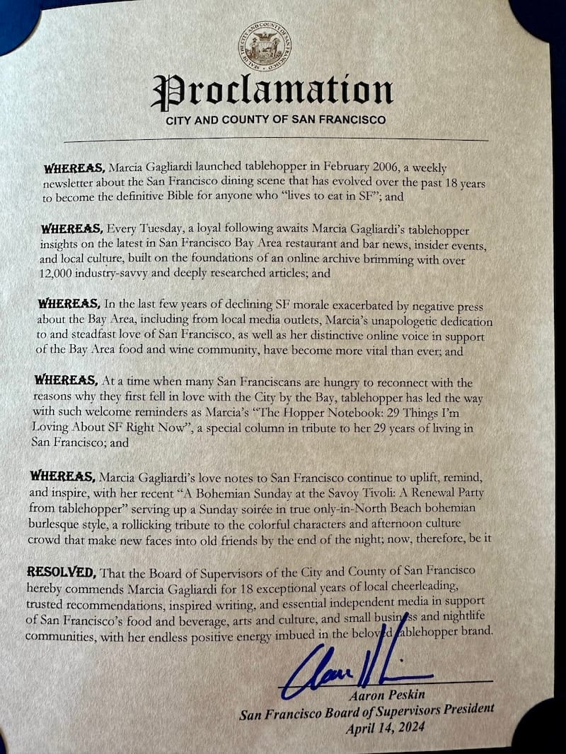 I was blown away with the proclamation—I had no idea how much he was going to say about my work, and how strongly his words were going to resonate with everyone in the room. It was such a thoughtfully written recognition of tablehopper, and my work in service of my love for SF. The party was already feeling so magical, but this moment really added some deep significance to the celebration. I am so grateful. Thank you, President and Supervisor Peskin—you already had my vote for Mayor!